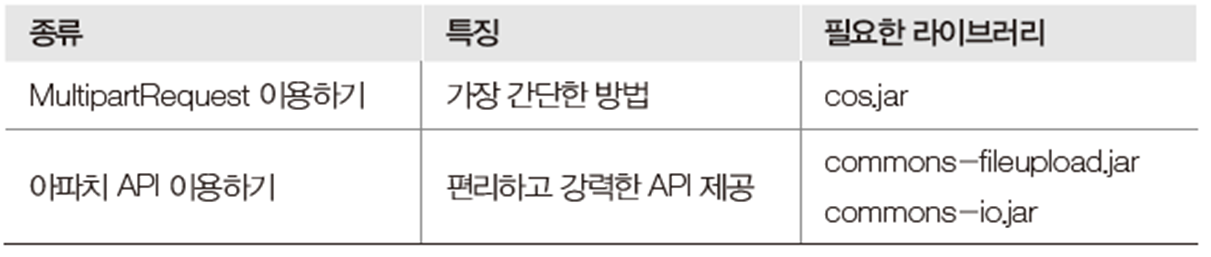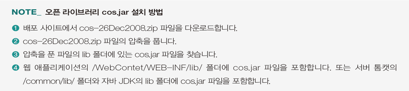 - 단순한 자바 코드로 작성하여 처리할 수 없어 오픈 라이브러리인 cos.jar나 commonsfileupload.jar를 사용해야 함