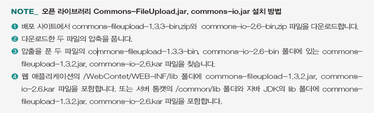 - 오픈 라이브러리 commons-fileupload.jar, commons-io.jar 파일을 배포 사이트에서 직접 다운로드해서 사용