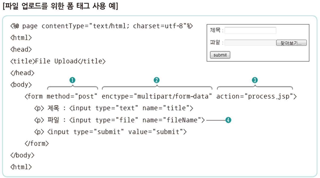 - 웹 브라우저에서 서버로 파일을 전송하기 위해J SP 페이지에 폼 태그 사용