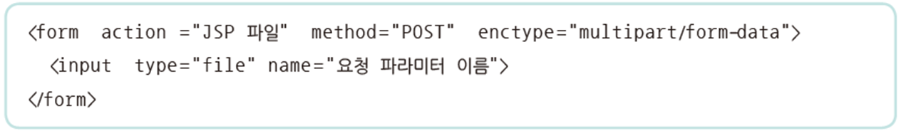 - 웹 브라우저에서 서버로 파일을 전송하기 위해 JSP 페이지에 폼 태그를 작성할 때 몇 가지 중요한 규칙