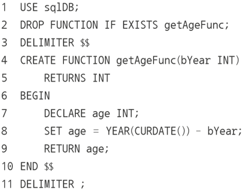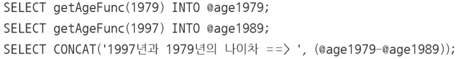 - SELECT userID, name, getAgeFunc(birthYear) AS '만 나이' FROM userTbl;